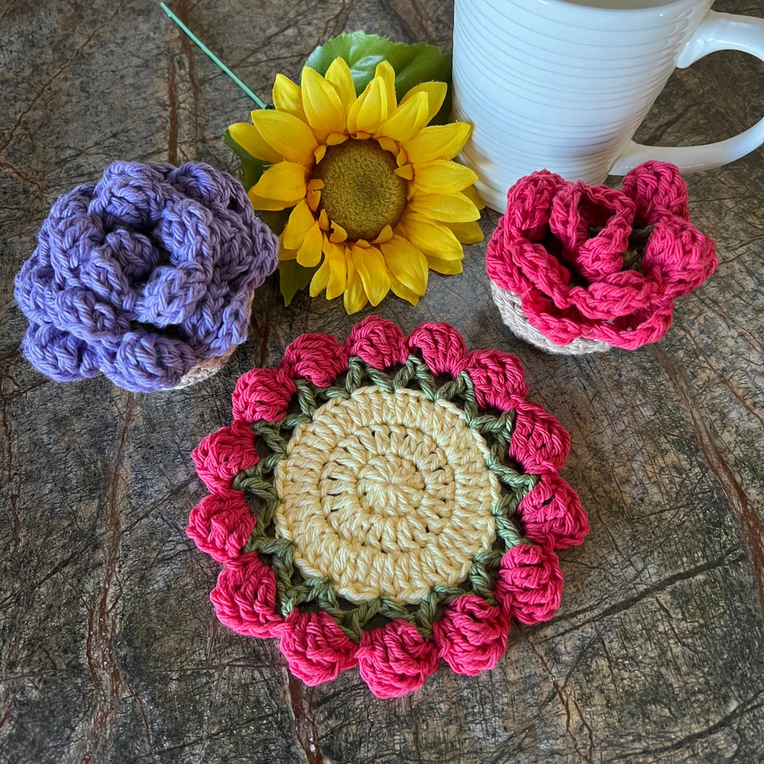This crochet flower coaster set is perfect for spring and summer in a variety of color combinations or as a handmade gift for Mother's Day or Valentine's Day. Alternate of MR: Ch 5, sl st in 5th ch from your hook to form a ring.
